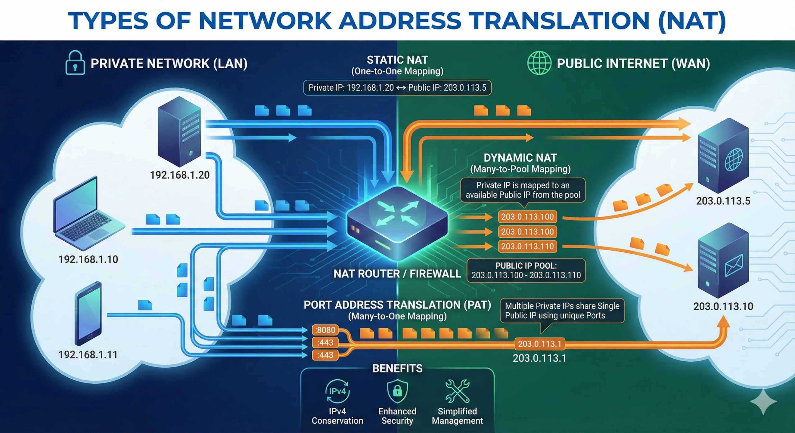 Network Address Translation (NAT) is a technique used in networking to modify the source or destination IP addresses of packets as they traverse a routing device, such as a router or firewall. This process enables multiple devices within a private network to access external networks, like the internet, using a single public IP address, thereby conserving IP address space and enhancing security. Types of Network Address Translation: 1. StaticRead more