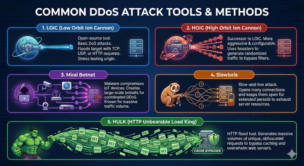 1. Low Orbit Ion Cannon (LOIC): Open-source tool used for basic DoS attacks.