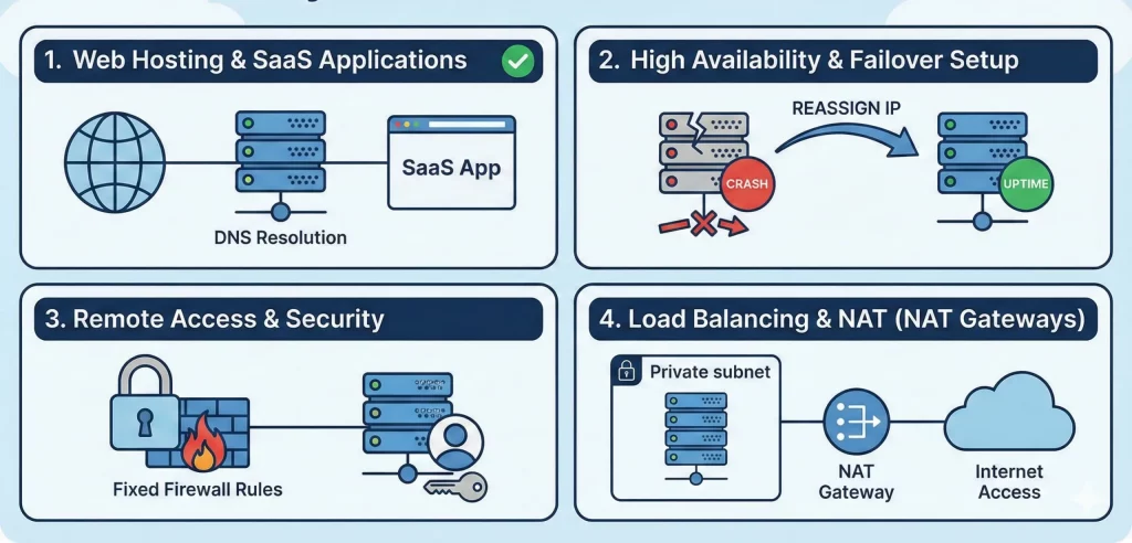 Elastic IPs are ideal for high-availability cloud deployments. Here are some common use cases: