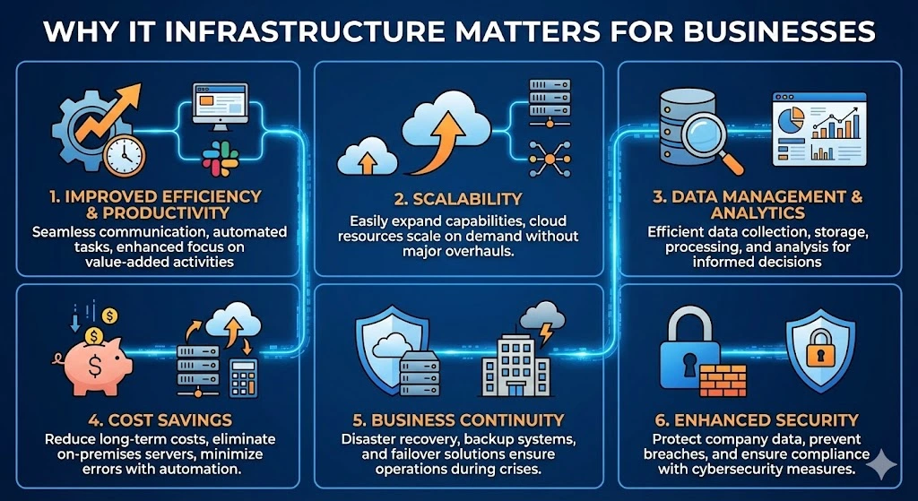 A reliable IT infrastructure helps businesses remain operational during crises or unforeseen events. Disaster recovery plans, backup systems, and failover solutions are essential for ensuring business continuity in the face of cyberattacks, hardware failures, or natural disasters.