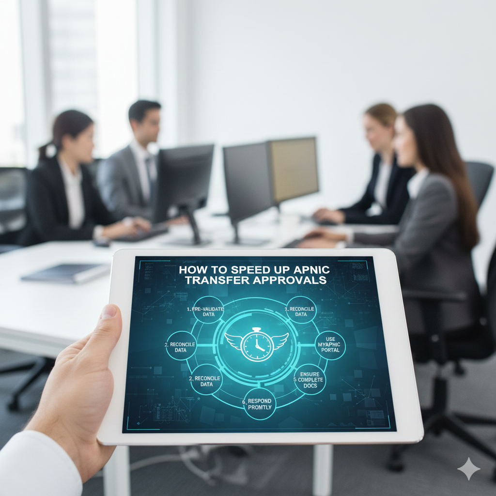 Speeding up APNIC transfer approvals is primarily about preparing inputs that are policy-aligned, time-safe, and registry-clean. APNIC itself provides the blueprint: seek pre-approval to “avoid unexpected delays”; acknowledge transfers within 30 days to prevent cancellation; and ensure fees are ready so registry updates are not held up.