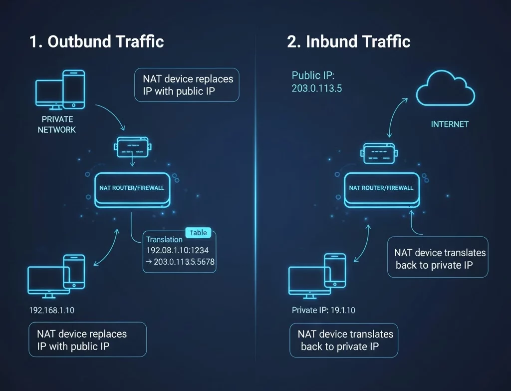 When a device on a local network (with a private IP address) sends a packet to the internet, the NAT device (usually a router) replaces the private IP address in the packet’s header with the router’s public IP address.