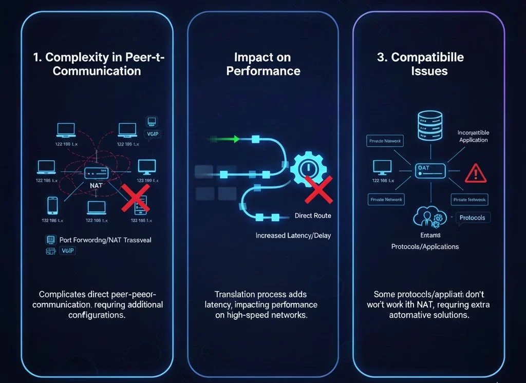 Despite its benefits, NAT has some limitations that need to be considered: