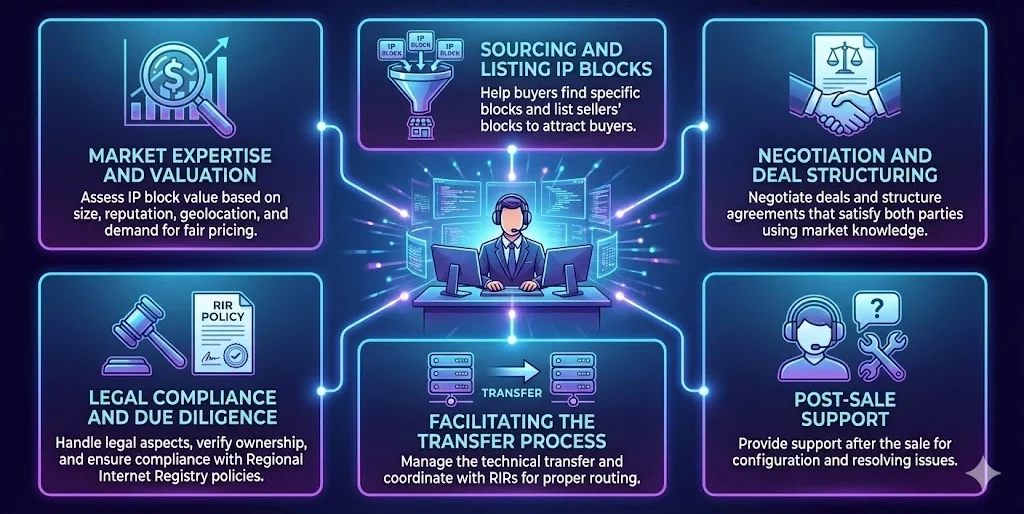 Facilitating the Transfer Process: Brokers manage the technical transfer of IP addresses, coordinating with RIRs, and ensuring proper routing.