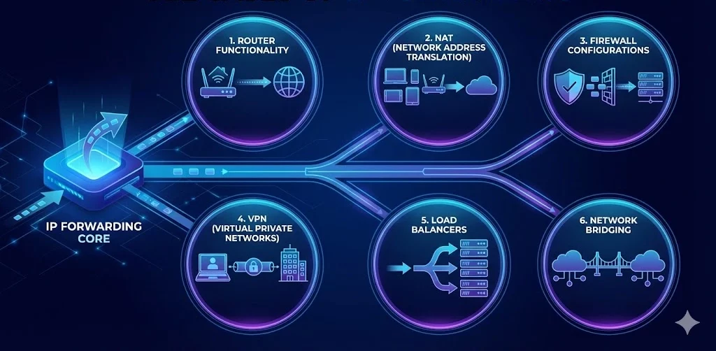The most common use case for IP forwarding is in routers, which form the backbone of any network communication infrastructure. Routers forward packets between local networks and larger networks, such as the Internet, ensuring data reaches its destination across multiple hops or networks. This is the core functionality of routers in homes, offices, and data centers.