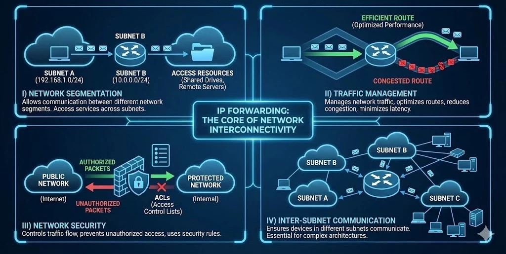 In large networks, subnets are used to divide network traffic into smaller, more manageable segments. IP forwarding ensures that devices in different subnets can still communicate with each other, which is essential for larger organizations with complex network architectures.