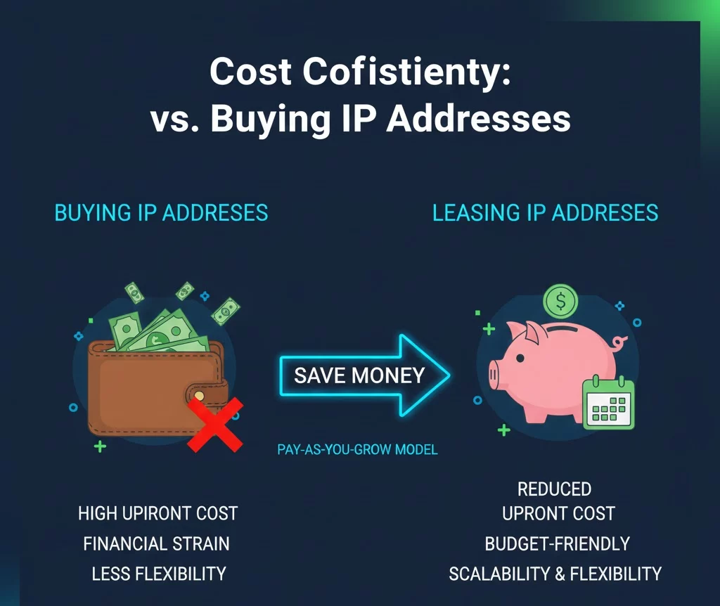 Yes, significantly. Buying a block of IPv4 addresses requires a large upfront capital expenditure (CapEx), often costing over $50 per IP. Leasing shifts this to a predictable operating expense (OpEx), typically costing less than $1.00 per IP per month, preserving your company’s cash flow.